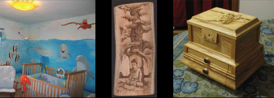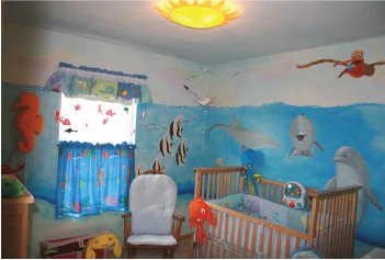 This was a mural that I did for a friend and her husband back in the mid 2000s for their new baby. Her in-laws were coming to visit and having the room all set up with this mural was how she wanted to let them know that she was pregnant with thier first grandchild! I was honored to be a part of it. The other side of the room had an underwater sandbar with all sorts of animals. Unfortunately there was a lot of furniture obscuring it when I went to take photos! I gained a rabbit from this adventure that ended up being the light of my life for the subsequent 10 years, so I certainly gained a lot for this one!