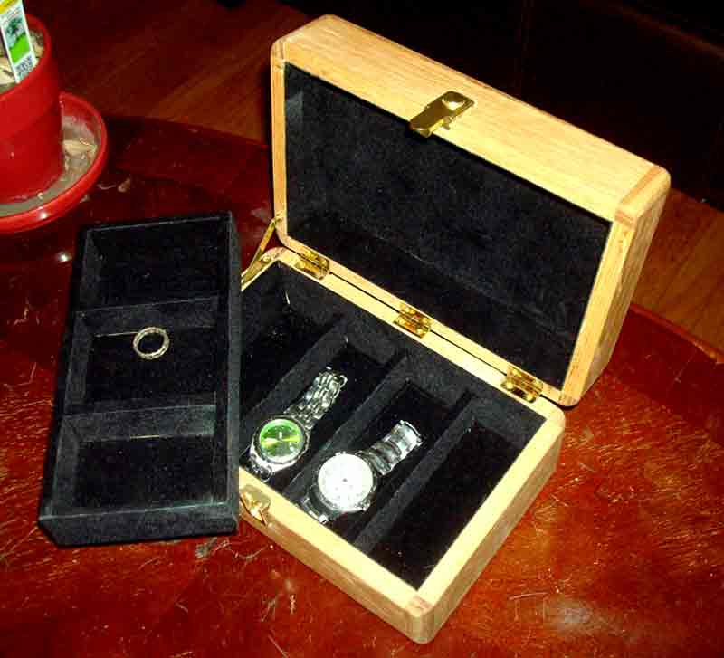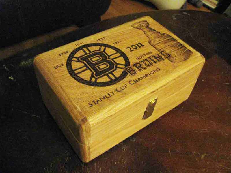 I made this watch box for a Bruins fan who collected watches when Boston won the Stanley Cup in 2011. It's made of oak and poplar with a push latch, a tray, and black velvet lining.