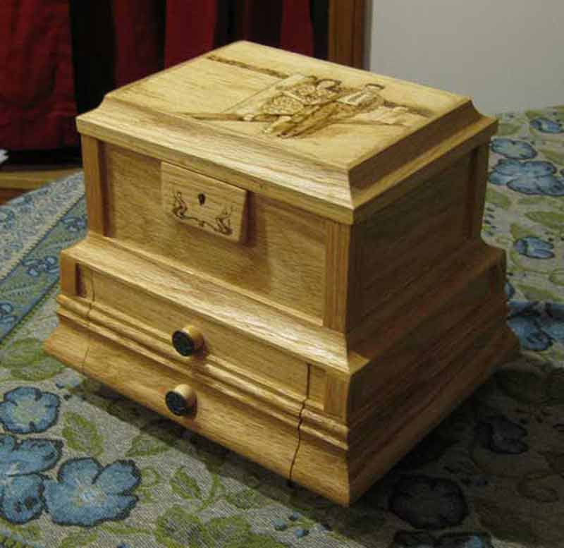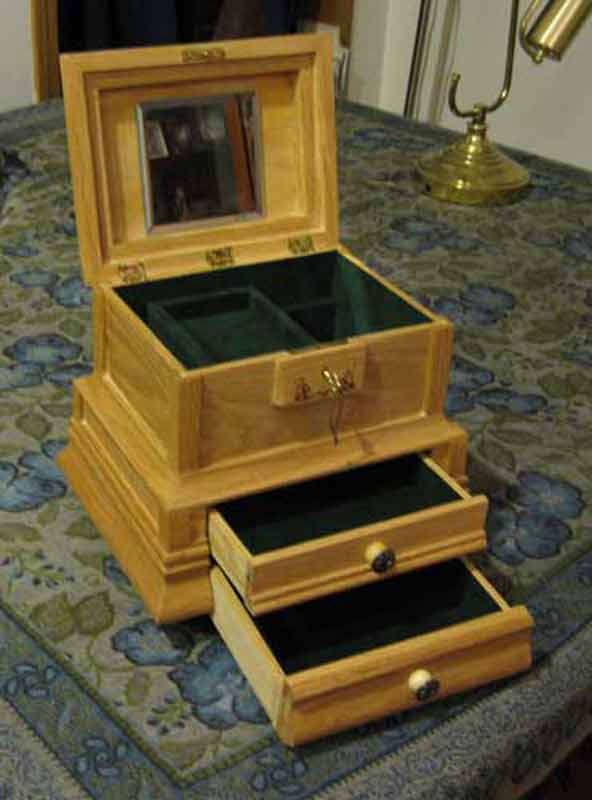 This was a jewelry box that I made for a close friend's mother for her 50th wedding anniversary. The image on the top was taken on their honeymoon. I made this box from scratch with some poplar, maple, oak, and various pieces of trim. It took about 3 weeks to complete, and includes a lock, a tray in the top part, two drawers, and forest green velvet lining. As far as I know she still uses it.